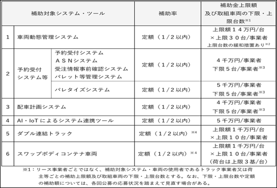 令和7年度「トラック輸送省エネ化推進事業」は、トラック事業者と荷主等とが連携して取り組むことを要件として、(1)車両動態管理システム、予約受付システム等、配車計画システム及びAI・IOTによるシステム連携ツールの導入、(2)ダブル連結トラック及びスワップボディコンテナ車両の導入に要する経費の一部を支援することにより、輸送効率化を通じた消費エネルギーの削減効果を実証することを目的とするものです。