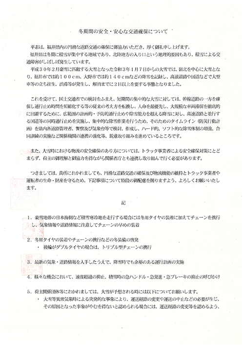福井河川国道事務所等より、「冬期間の安全・安心な交通確保」について要請がありました。