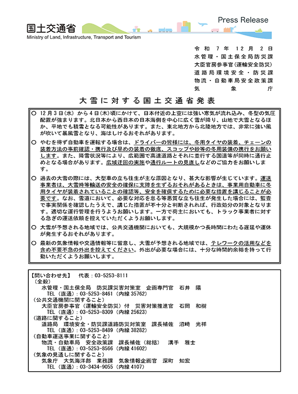 つきましては、積雪や暴風雪による通行止めや視界不良等に備え、以下の安全確保対策を徹底していただきますようお願いいたします。