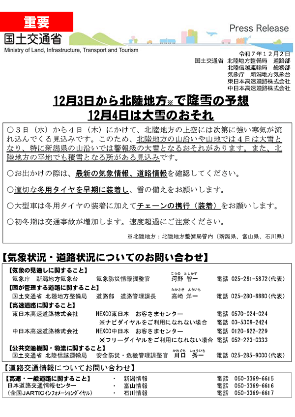 気象庁等の発表によりますと、12月3日(水)から4日(木)にかけて、強い寒気の影響で冬型の気圧配置が強まります。北日本から西日本の日本海側を中心に広く雪が降る見込みで、特に北陸地方(新潟県の山沿い)では4日にかけて警報級の大雪となる恐れがあり、北陸の平地でも積雪の可能性があります。さらに、東北地方から北陸地方では、非常に強い風による暴風雪となり、海はしける恐れがあります。