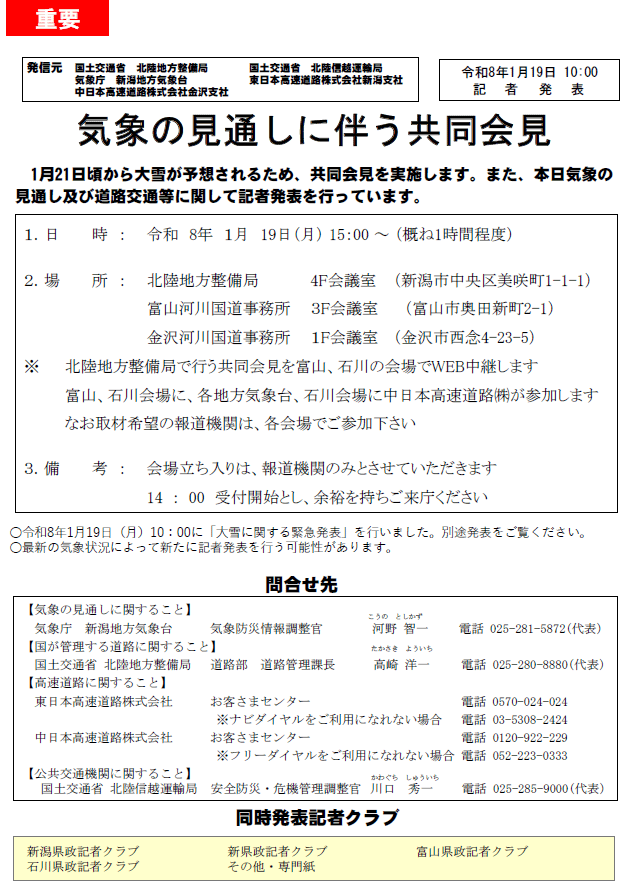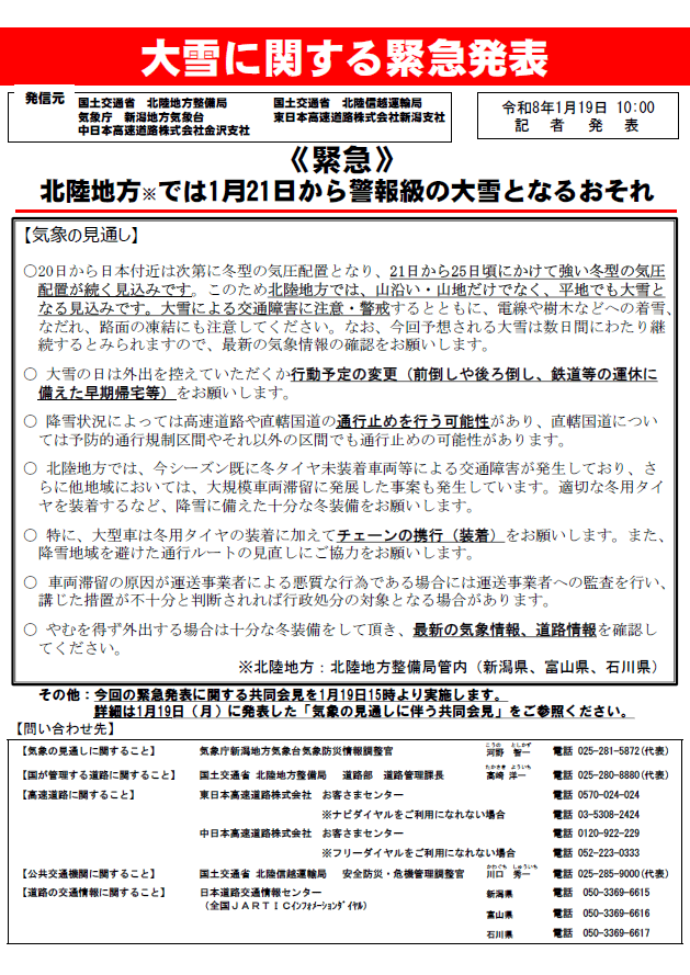 国土交通省北陸地方整備局より、大雪に関するお知らせがありました。