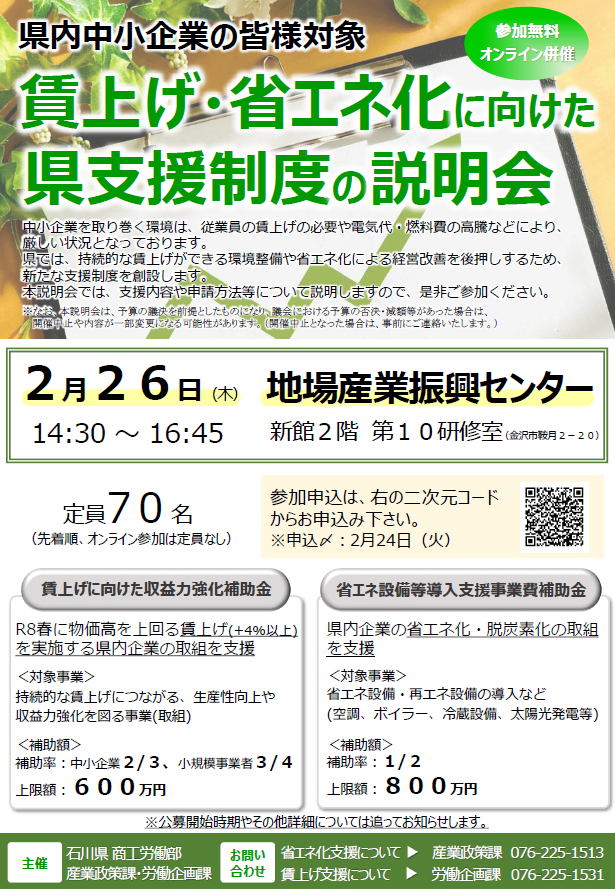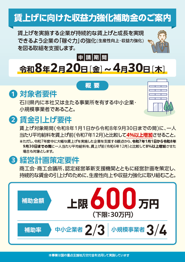 石川県では、賃上げを実施する企業が持続的な賃上げと成長を実現できるよう企業の「稼ぐ力」の強化(生産性向上・収益力強化)を図る取組を支援する補助制度が創設されましたのでお知らせいたします。