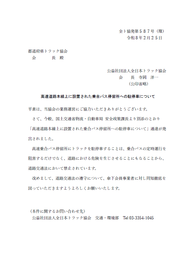 今般、国土交通省より「高速道路本線上に設置された乗合バス停留所への駐停車について」の通達が発出されましたのでご連絡いたします。
