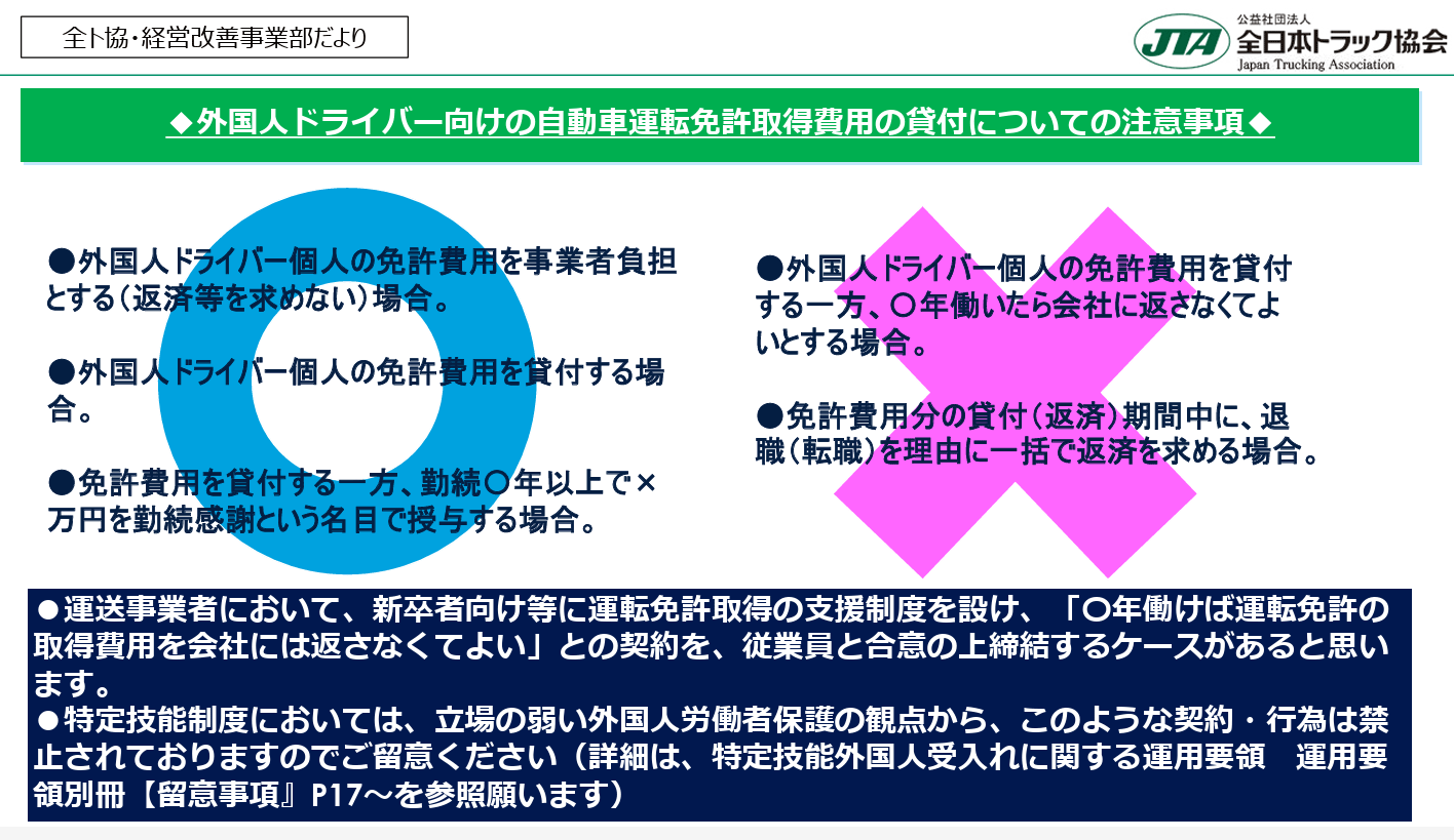 外国人ドライバー向けの自動車運転免許取得費用の貸付についての注意事項について、以下の点にご留意ください。